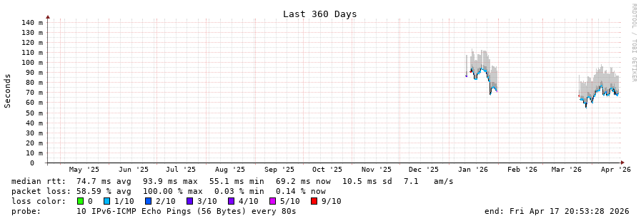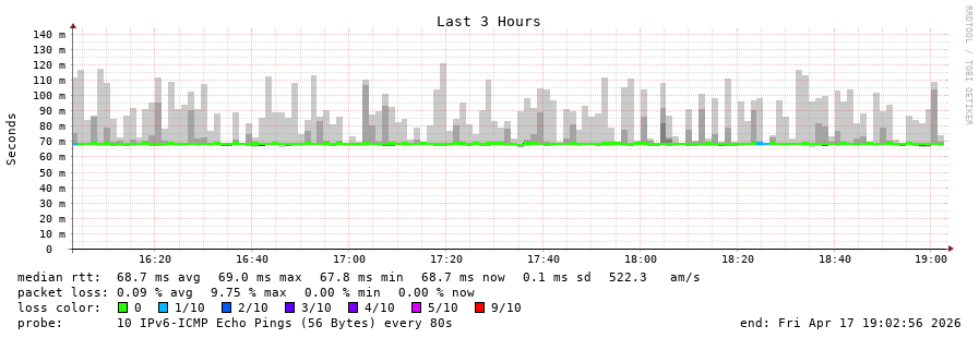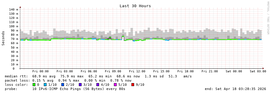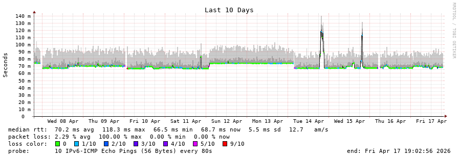 traceroute to 2001:470:1f13:814:1ad6:c7ff:fe2a:502 (2001:470:1f13:814:1ad6:c7ff:fe2a:502), 30 hops max, 80 byte packets - Generated at 2026-04-17 09:30:01