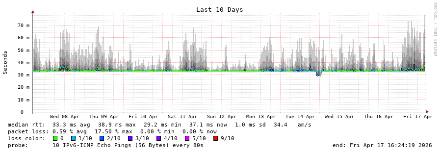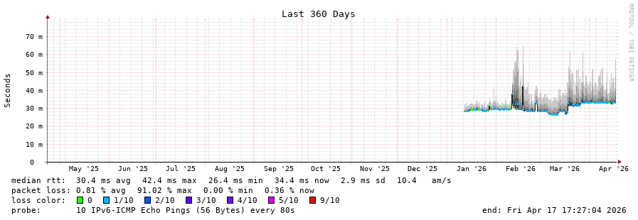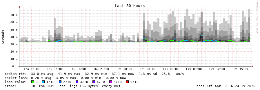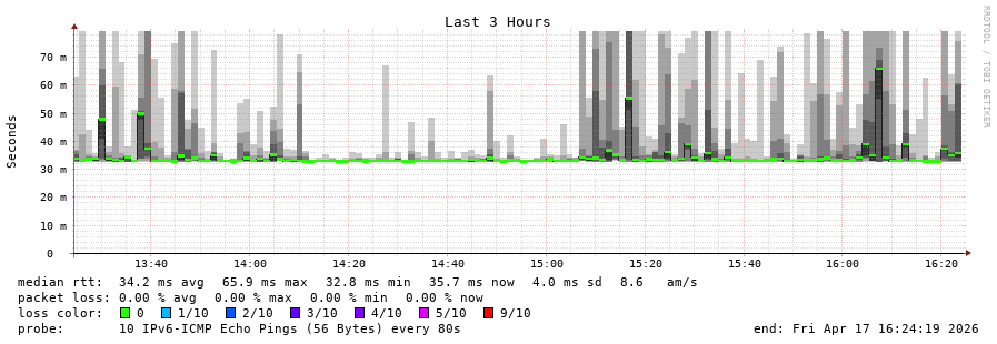 traceroute to 2001:67c:1e0:0:c225:e9ff:fea8:6a0a (2001:67c:1e0:0:c225:e9ff:fea8:6a0a), 30 hops max, 80 byte packets - Generated at 2026-04-17 13:15:01