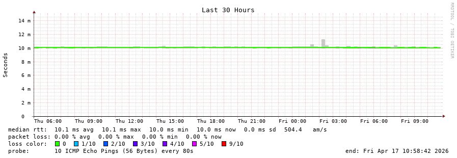 13 > smokeping.serverius.net (5.255.66.253) [*] 10.148ms 10.078ms 10.071ms