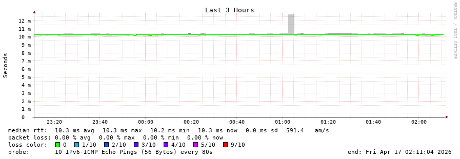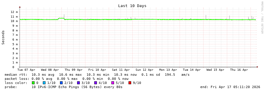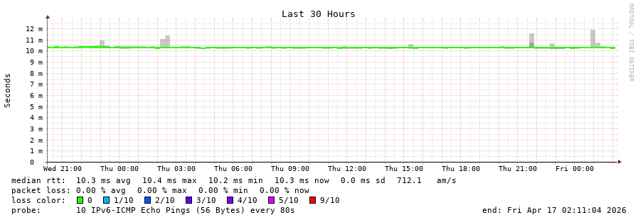 13 > fdff:f000:32::1 (fdff:f000:32::1) [*] 10.805ms 10.624ms 10.612ms