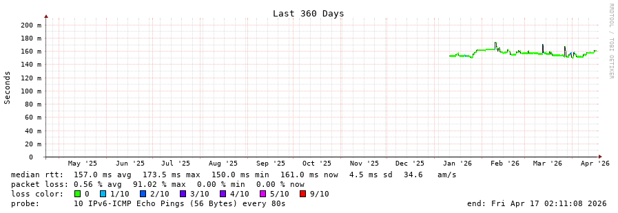 traceroute to 2604:2dc0:202:200::1f9 (2604:2dc0:202:200::1f9), 30 hops max, 80 byte packets - Generated at 2026-04-17 01:15:01